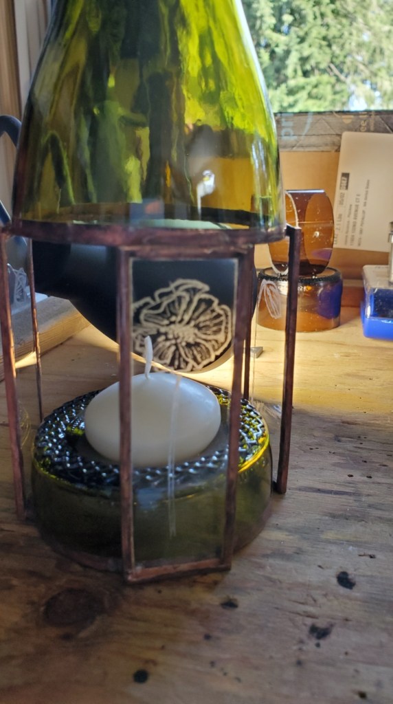 Ok, so bottle crafts are the most challenging of all the glass arts I have tried so far. I can’t count the number of bottles I have tried to cut that have resulted in being tossed due to a bad break. At least I have learned to keep them separated by color so I can maybe melt them down in my kiln.