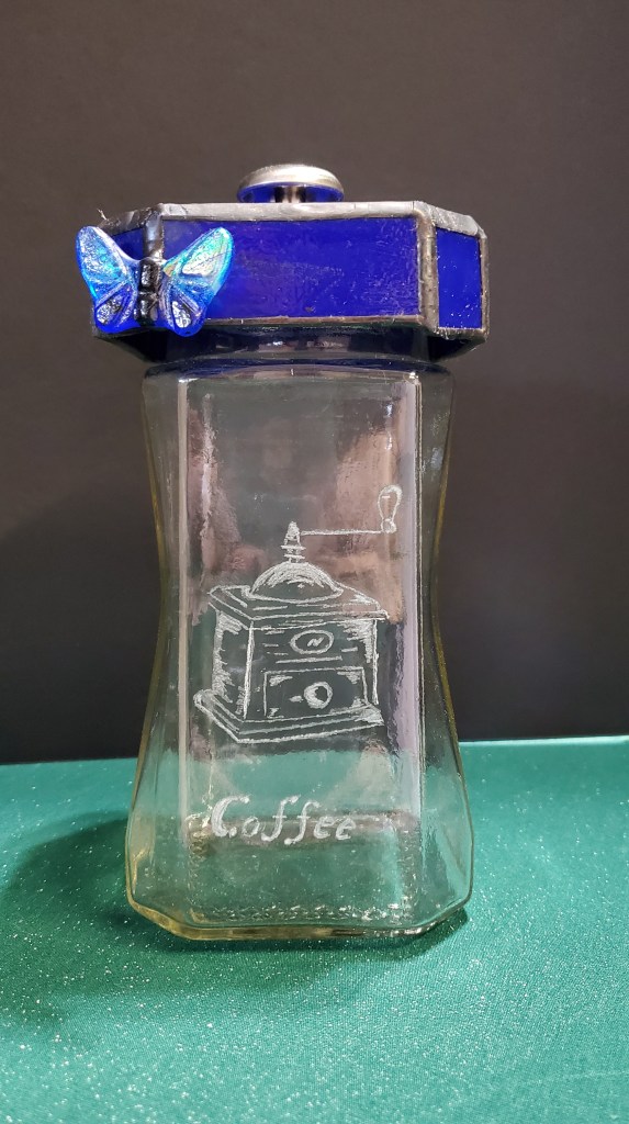Canisters from coffee jars: So, are these bottle crafts? Or stained glass? Or glass engraving? All of the above. I chose to share them here because they started life as a jar, so I consider them to be recycled projects.
