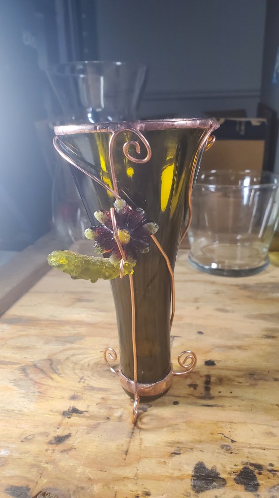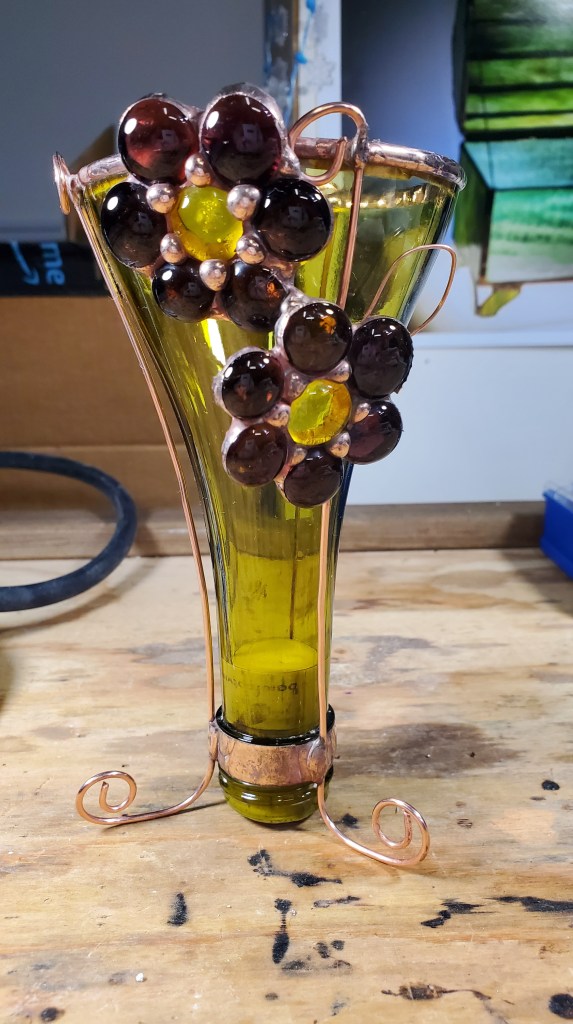 These items are made from the tops of wine bottles. Each has a different shape. All three have copper wire soldered to the neck of the bottle to establish a base so they can stand solidly. Each has been embellished with a unique design. The item on the far left was created from glass cast flower and leaf. The leaf was cast from ground up wine bottle. The item in the middle is decorated with glass gems to look like grapes on a grape vine. I am happy with how these turned out.