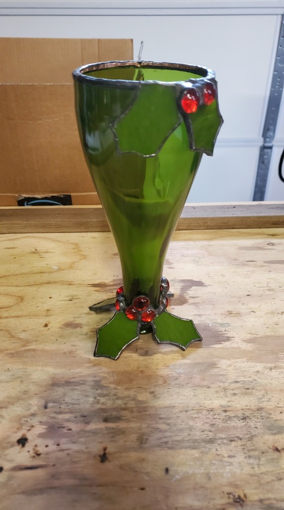 I used green stained glass to cut the holly leaves and red glass nuggets to create a ring of holly around the bottom of the bottle, then topped it with the 2nd bottle section.