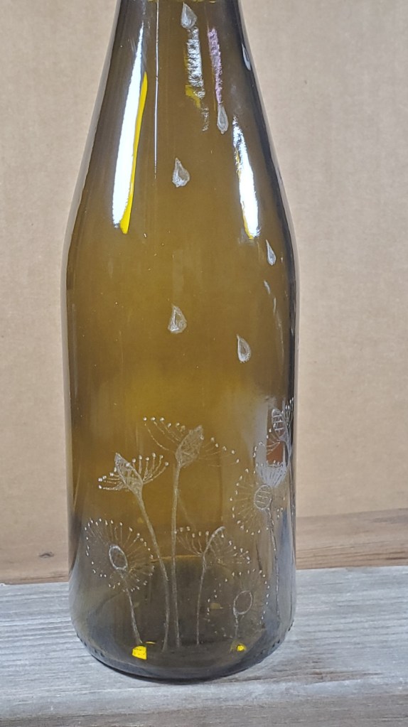 A circle of dandelions and rain drops have been engraved around half of the bottle.