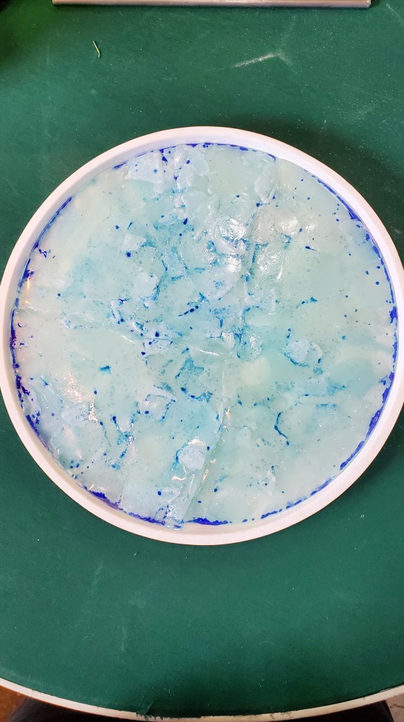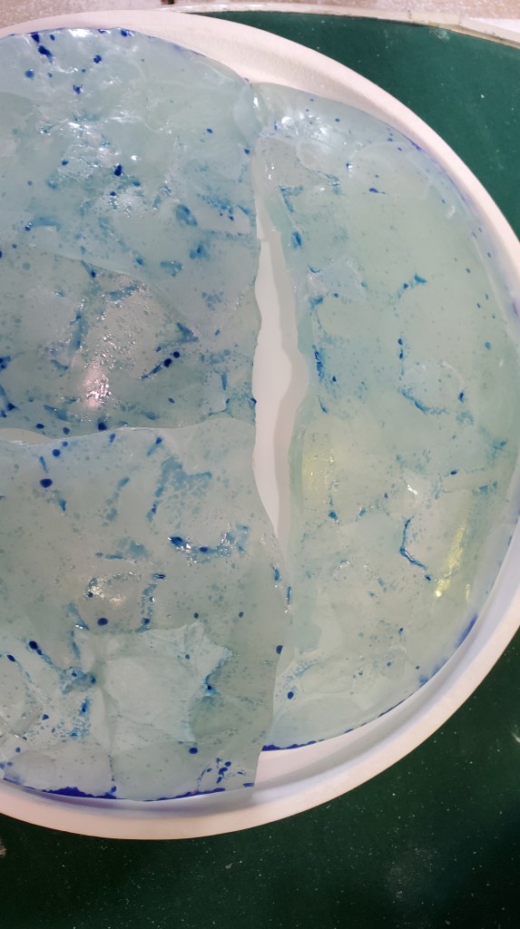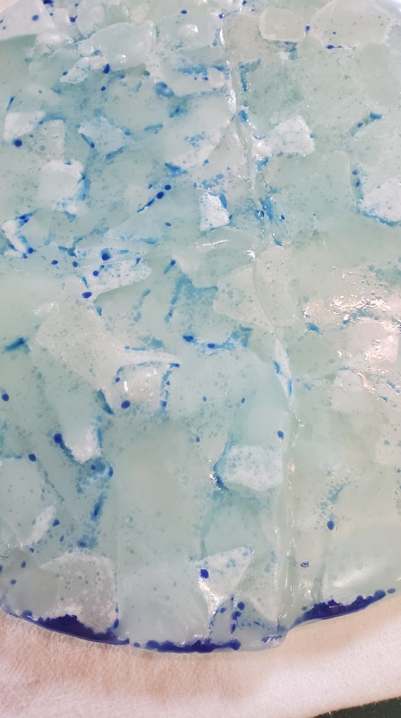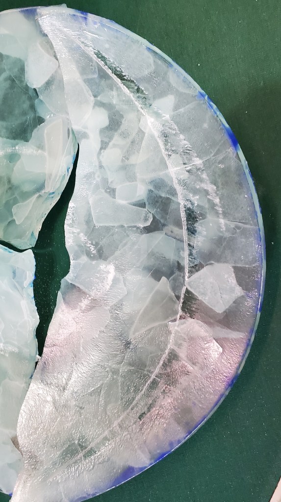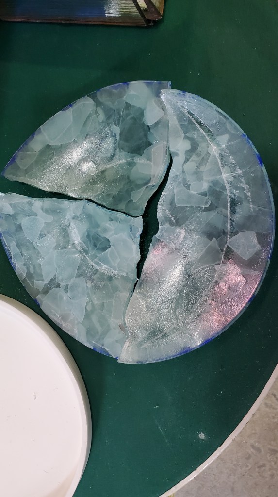 First fire: After smashing the clear wine bottle I had that didn’t make it past the cutting stage, I arranged them on a 12 inch round dam. I tried to layer the glass so it overlapped and tried to keep it to about 6 mm deep. I used a schedule specific to COE 82 that is pre-programmed into my kiln. This is the starting point…The result was kind of cool. I’m only sorry I didn’t capture a picture at this point. The only real issue was lots of devitrification.