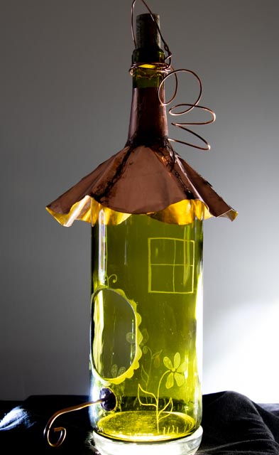 After my husband drilled two side by side holes, effectively creating an oval opening, I engraved some simple flowers and windows on the wine bottle, then added a copper roof. The biggest challenge of the project was the roof. I cut 8 triangles and soldered them together and attached it to the neck of the bottle using wide copper foil and soldered it to the neck. I would like to find something that would keep the copper form discoloring after it has been outdoors for a period of time. If I did this again, I may try spraying a clear coat on the copper to see if it protects from the elements. I then drilled a small hole and added a perch – but, for the squirrels, it just gets in the way.