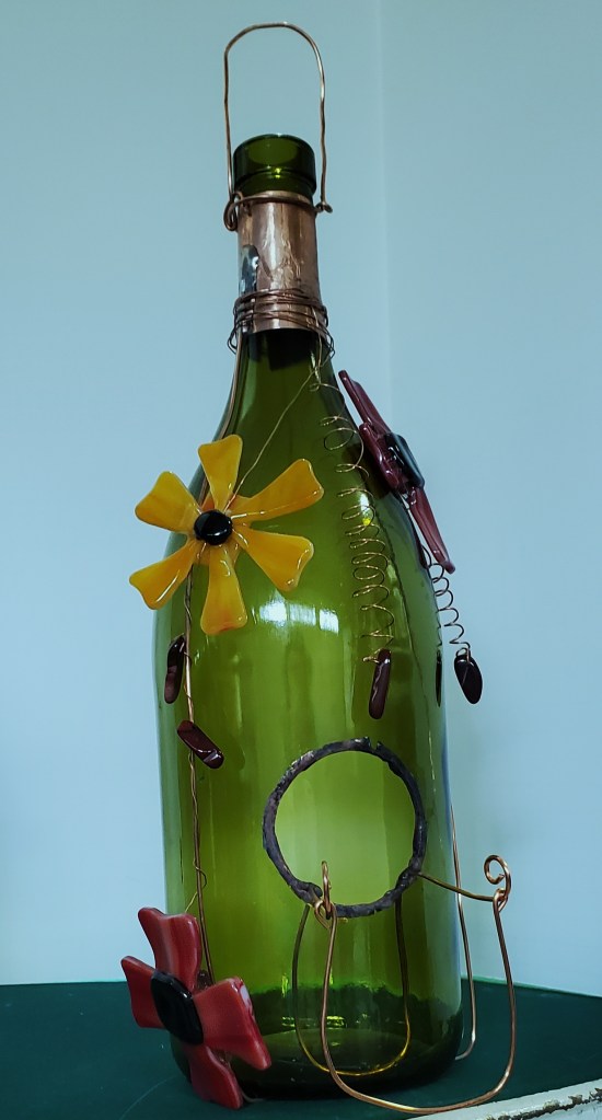 It’s a good thing I don’t charge by the hour. This bird feeder is decorated with hanging fuchsia flowers made from stained glass. Each flower is attached from the neck of the bottle by copper wire. The perch runs through both sides of the bottle and is made of copper tubing. The flowers are loose enough that they make a very gentle windchime as well as the bird feeder.