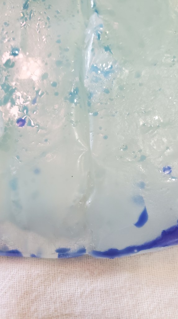 This fire did change the flow of the piece. The center is no longer as thick and the glass now seems to be a more consistent weight through out. But, those cracks still show. See pictures below. At this point, I am going to leave the plate of glass alone. As i learn a little more, I’ll try again. I’m not sure this piece will ever be whole again. But, I like the look of the glass that I am going to crush more bottles up and try this again.